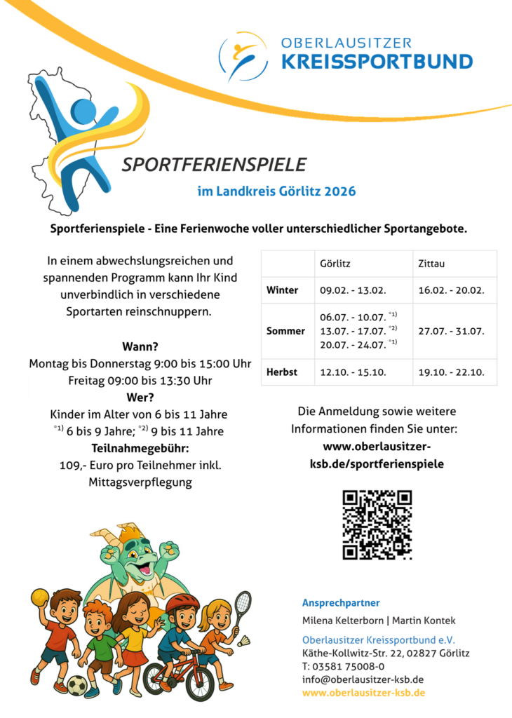 Der Oberlausitzer Kreissportbund lädt auch in diesem Jahr dazu ein, die guten Vorsätze zum Jahresbeginn umzusetzen und Kindern die Teilnahme an den Sportferienspielen zu ermöglichen. Die Veranstaltungen finden in den Winterferien an den Standorten Zittau und Görlitz statt. Auch für die Sommer- und Herbstferien wird es ein entsprechendes Angebot geben. Teilnehmen können alle Kinder im Alter von sechs bis elf Jahren aus dem Landkreis Görlitz.